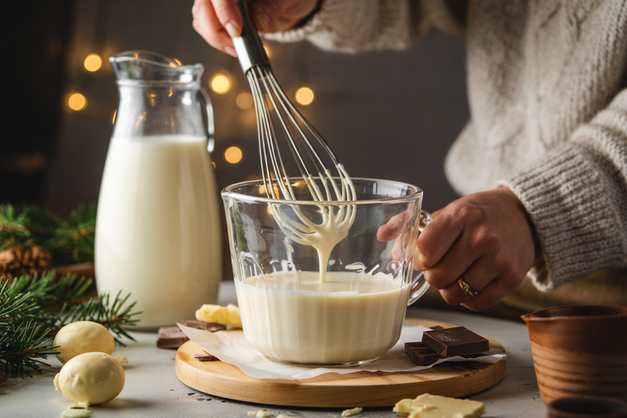 A rich, creamy, café-style winter latte made with melted vegan white chocolate, steamed plant milk, and a hint of peppermint. Cozy, soothing, dessert-like, and easier to make at home than Starbucks — with fewer ingredients and a velvety smooth frothy finish.