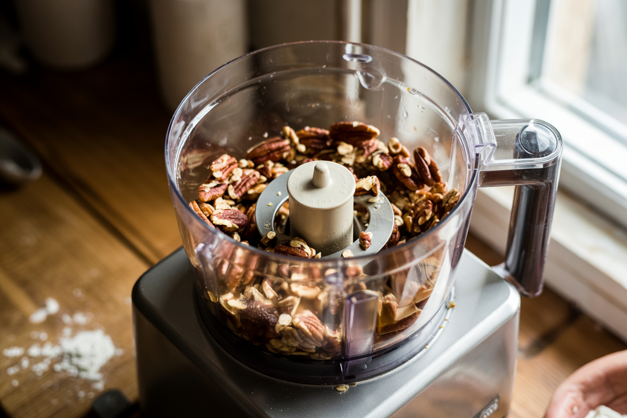 Add pecans, oats, dates, cinnamon, and salt to a food processor. Pulse until crumbly.