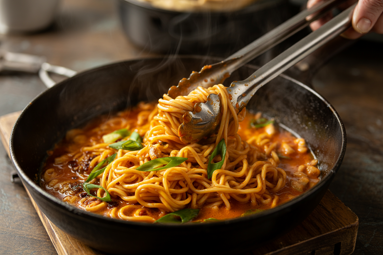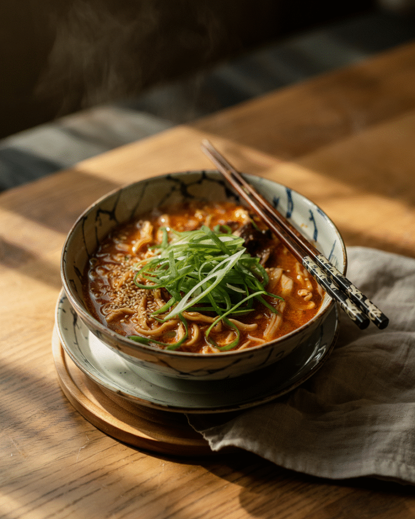 Think of this bowl as your weekday comfort ritual — a steaming bowl of noodles, chili heat, and cozy lighting.