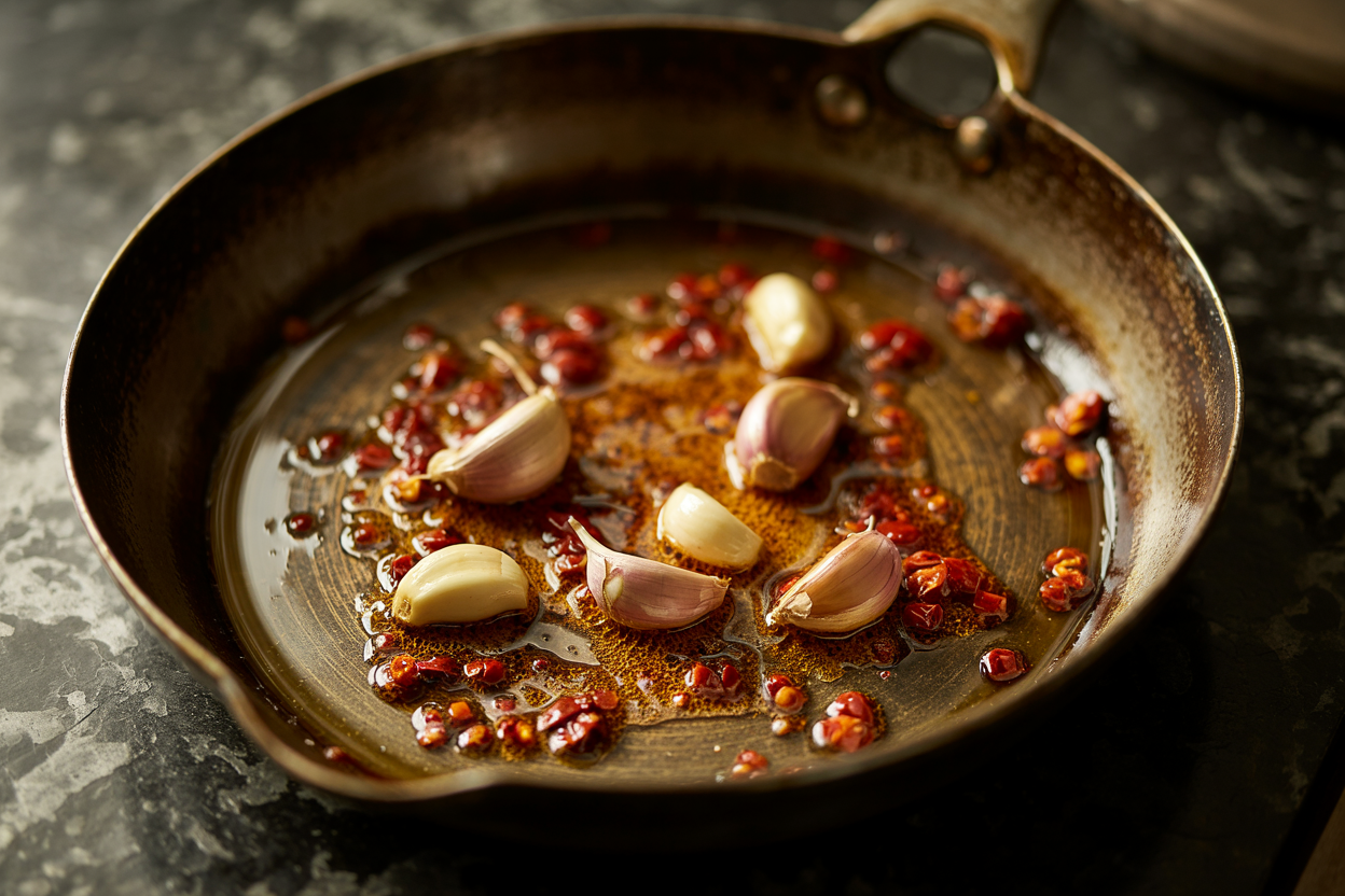 In a pan, heat sesame oil and chili oil. Add garlic, soy sauce, maple syrup, and vinegar.