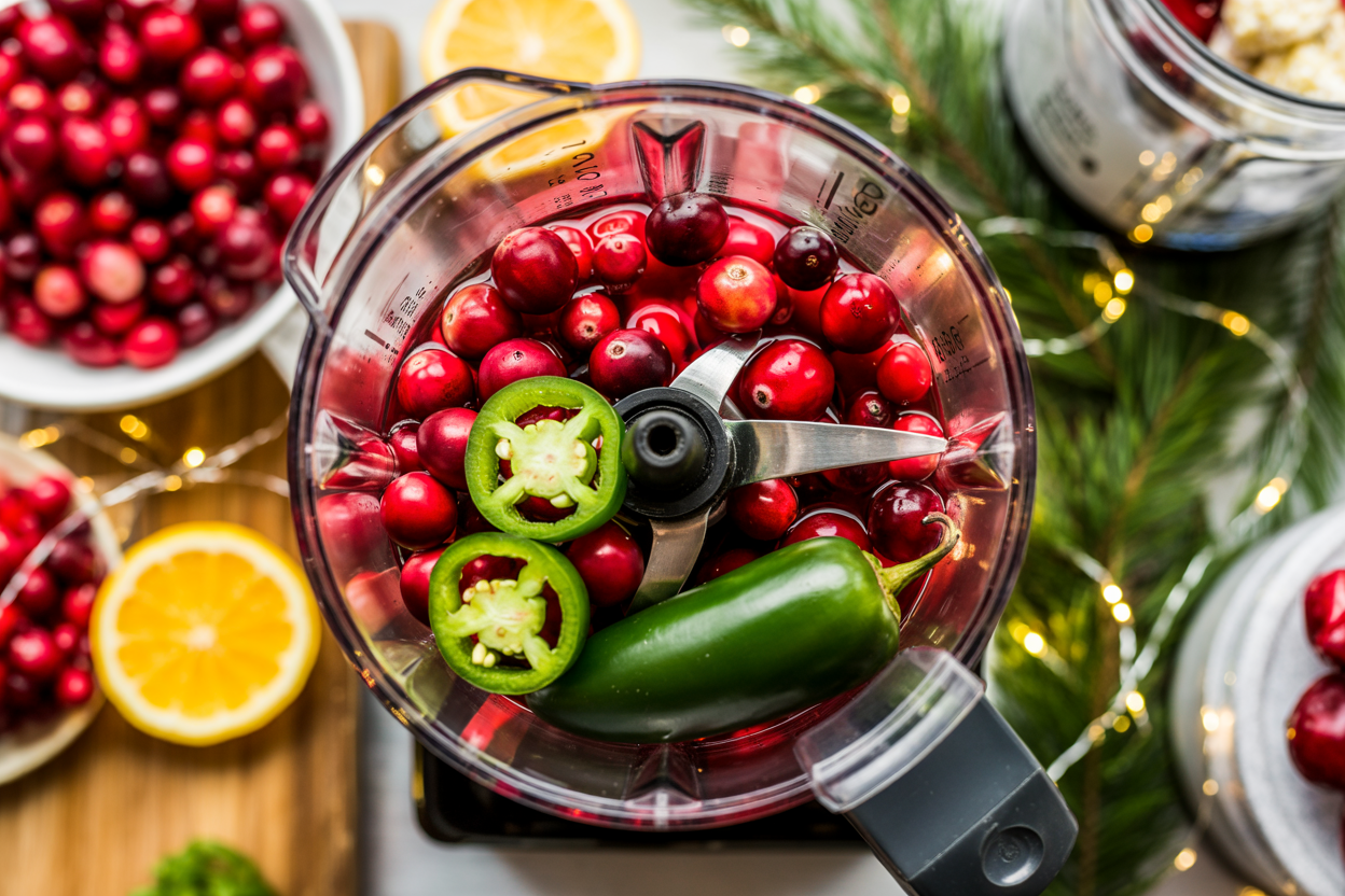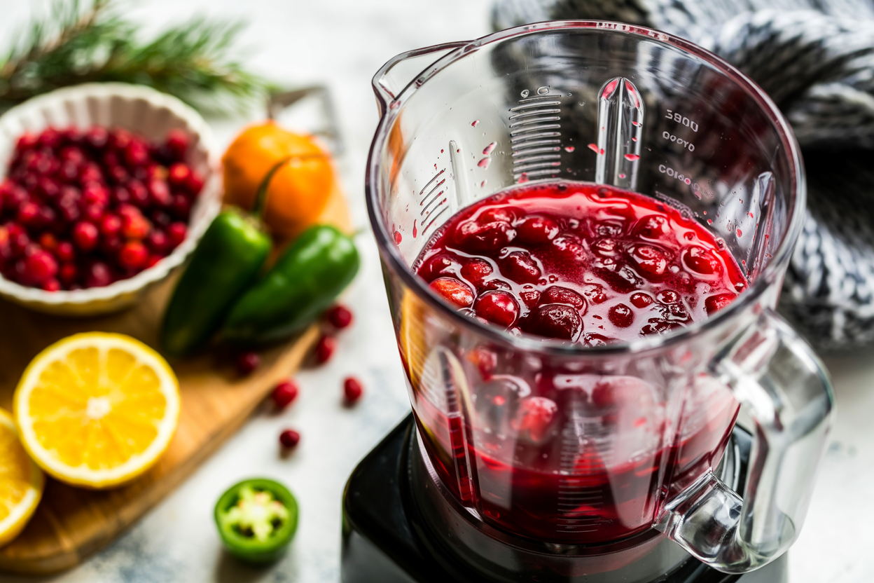 Add cranberries, jalapeño, maple syrup, citrus juice, and salt to a blender.