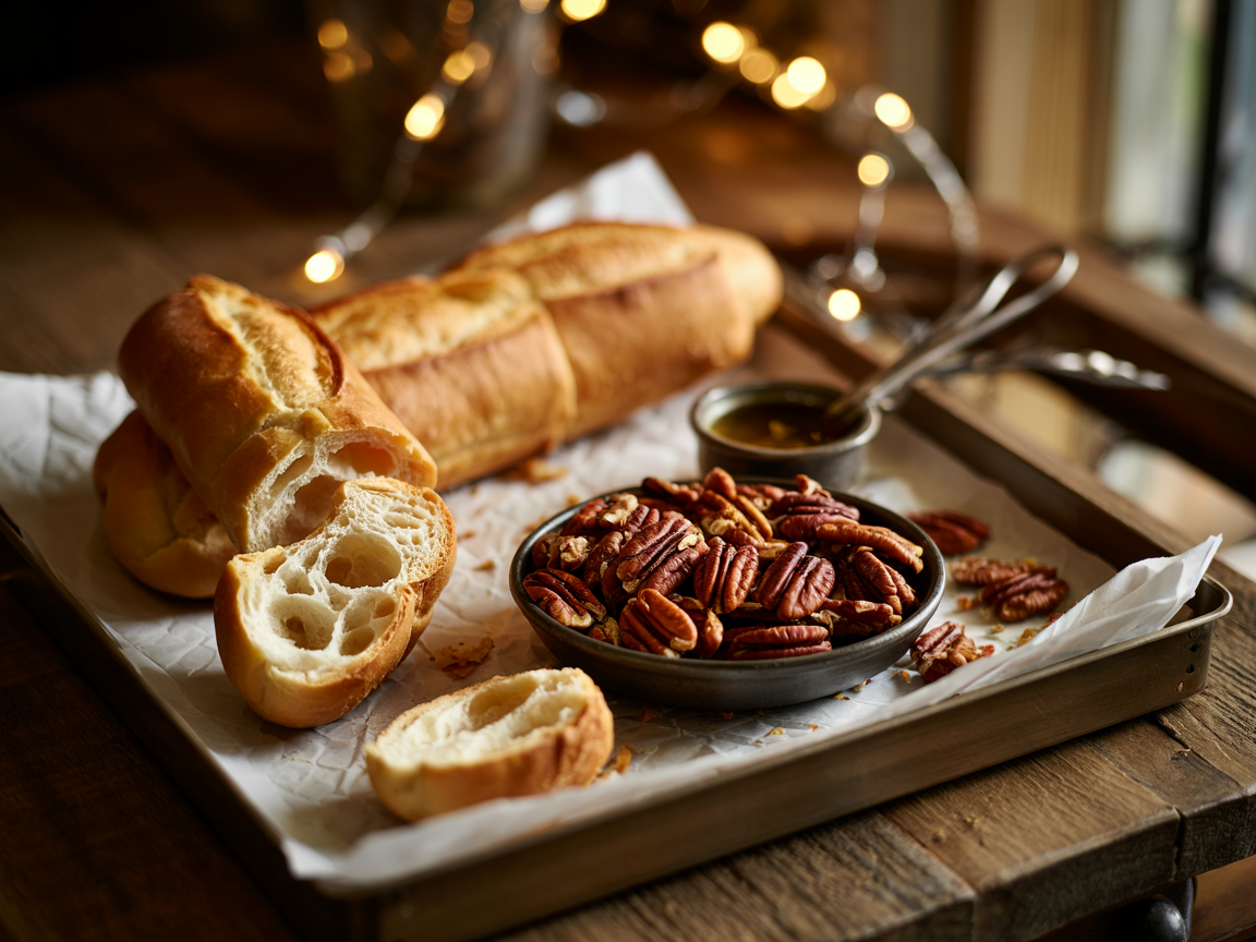 1. Roast pecans with a drizzle of maple syrup and sea salt at 350°F for 10 minutes; toast baguette slices until golden.