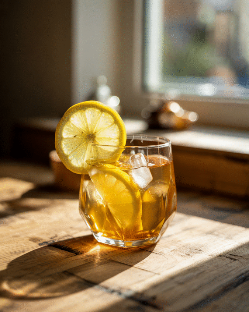 Pour over ice and garnish with a lemon slice or cucumber ribbon.