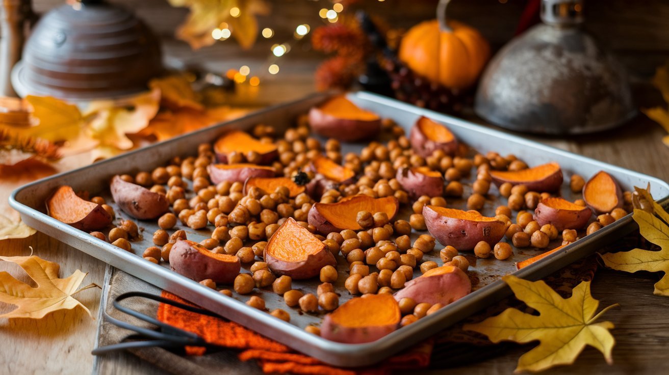 Preheat oven to 400°F (200°C). Toss cubed sweet potatoes and chickpeas with olive oil, salt, and pepper. Spread on a baking sheet and roast for 25–30 minutes, stirring halfway.