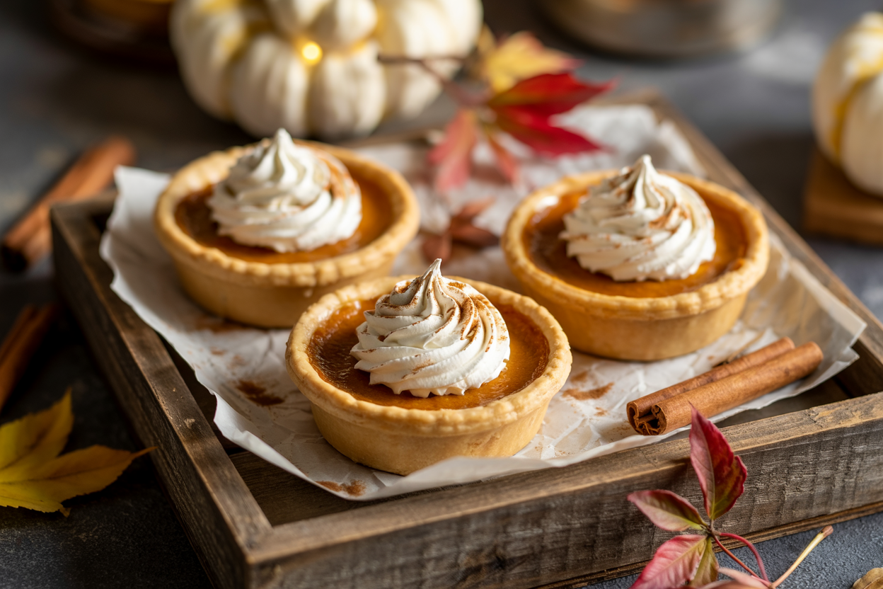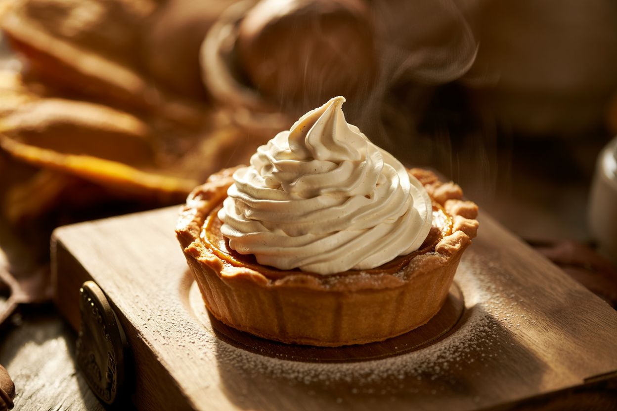 The golden crust flakes at the edges, the pumpkin filling shines with a caramel hue, and the maple coconut whip melts softly on top. They look like something you’d find in a cozy bakery window during Thanksgiving weekend — perfectly styled, perfectly nostalgic.