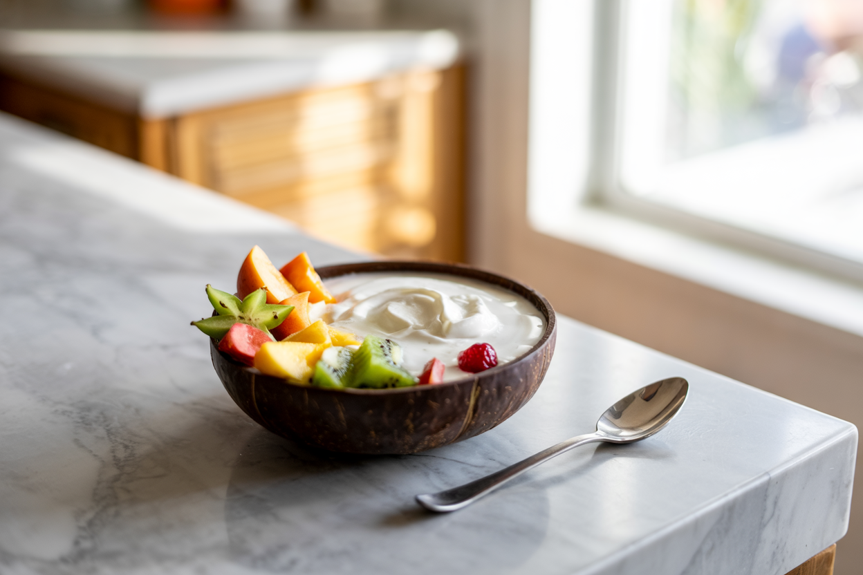 It’s made with fresh tropical fruits like mango and pineapple for natural sweetness, berries for antioxidants, and creamy coconut yogurt for plant-based protein.