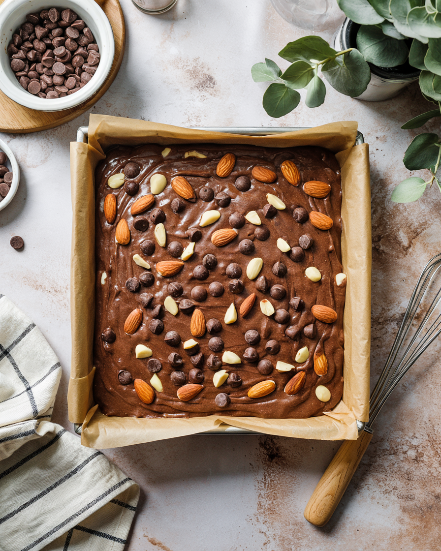Sprinkle dark chocolate chips or chopped nuts over the batter if desired.
