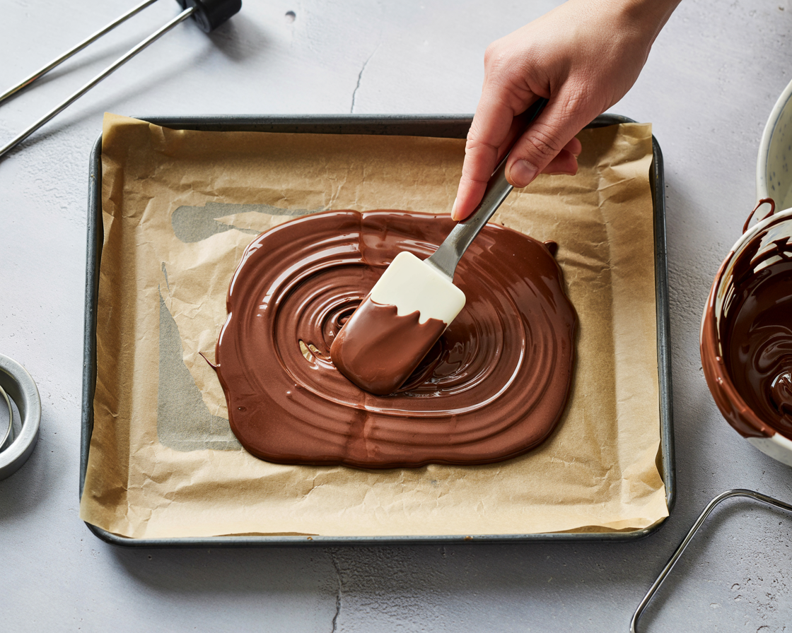 Pour melted chocolate onto a parchment-lined baking tray and spread into an even layer.