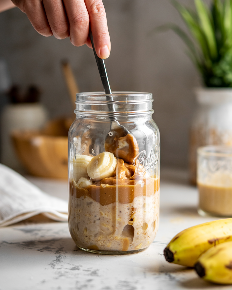 Mash half a ripe banana and add it to the jar along with peanut butter and vanilla extract. Stir until the mixture becomes creamy and evenly blended.