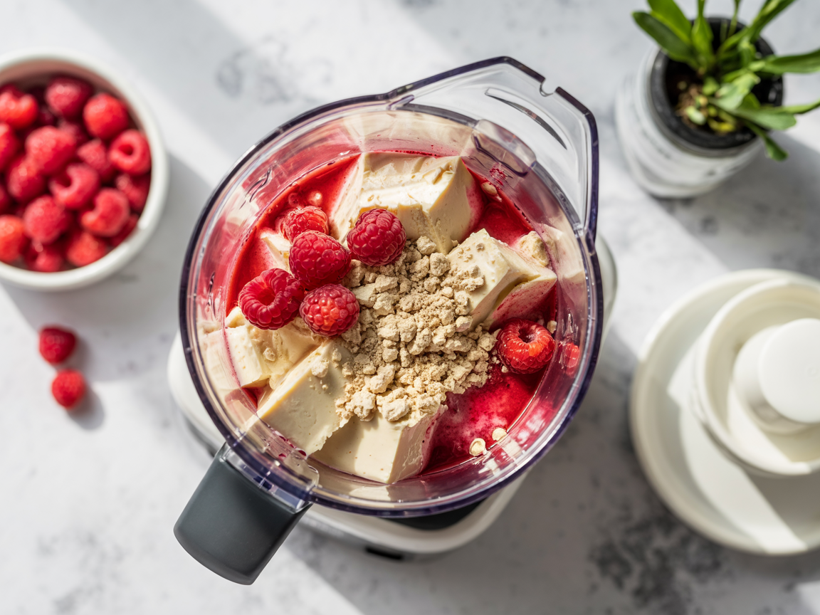 Add silken tofu, raspberries, protein powder, and sweetener to a blender or food processor.