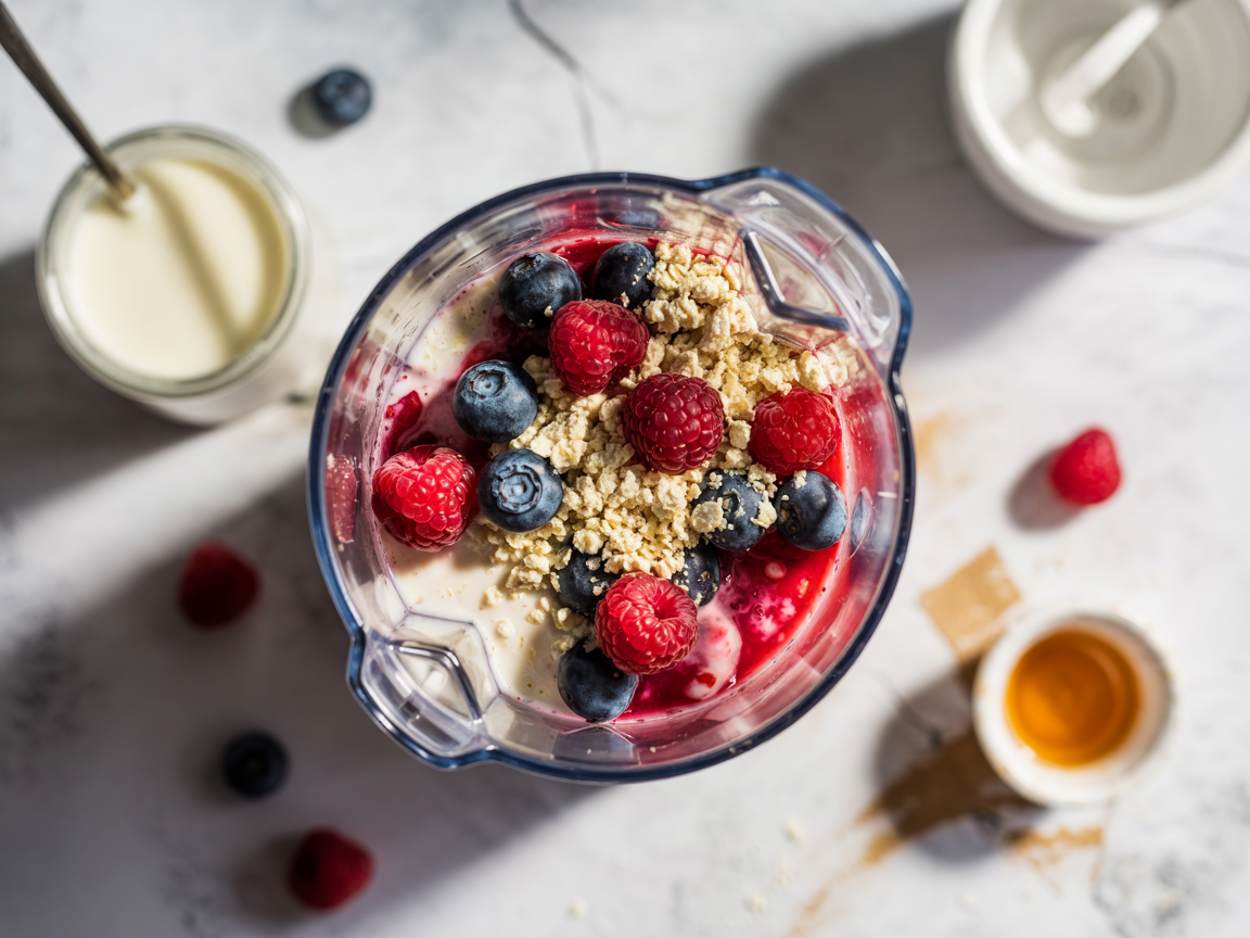 Add berries, vegan yogurt, protein powder, sweetener, and vanilla extract to a blender.