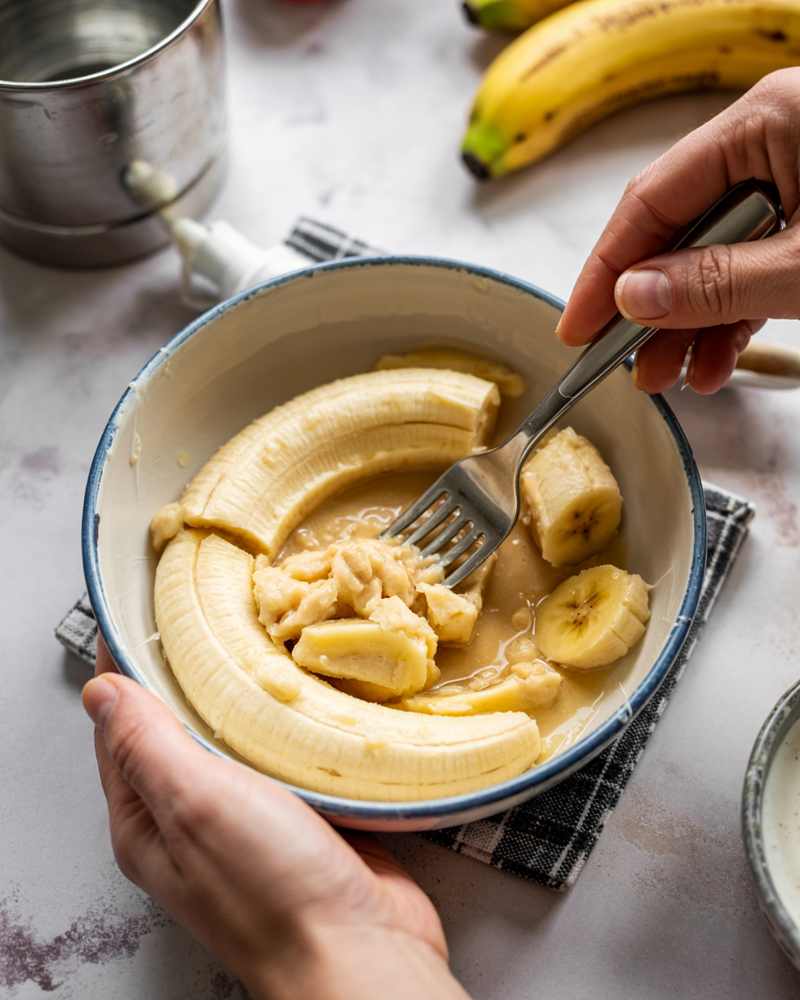 1. Add ripe bananas to a bowl and mash until mostly smooth with small lumps remaining.
