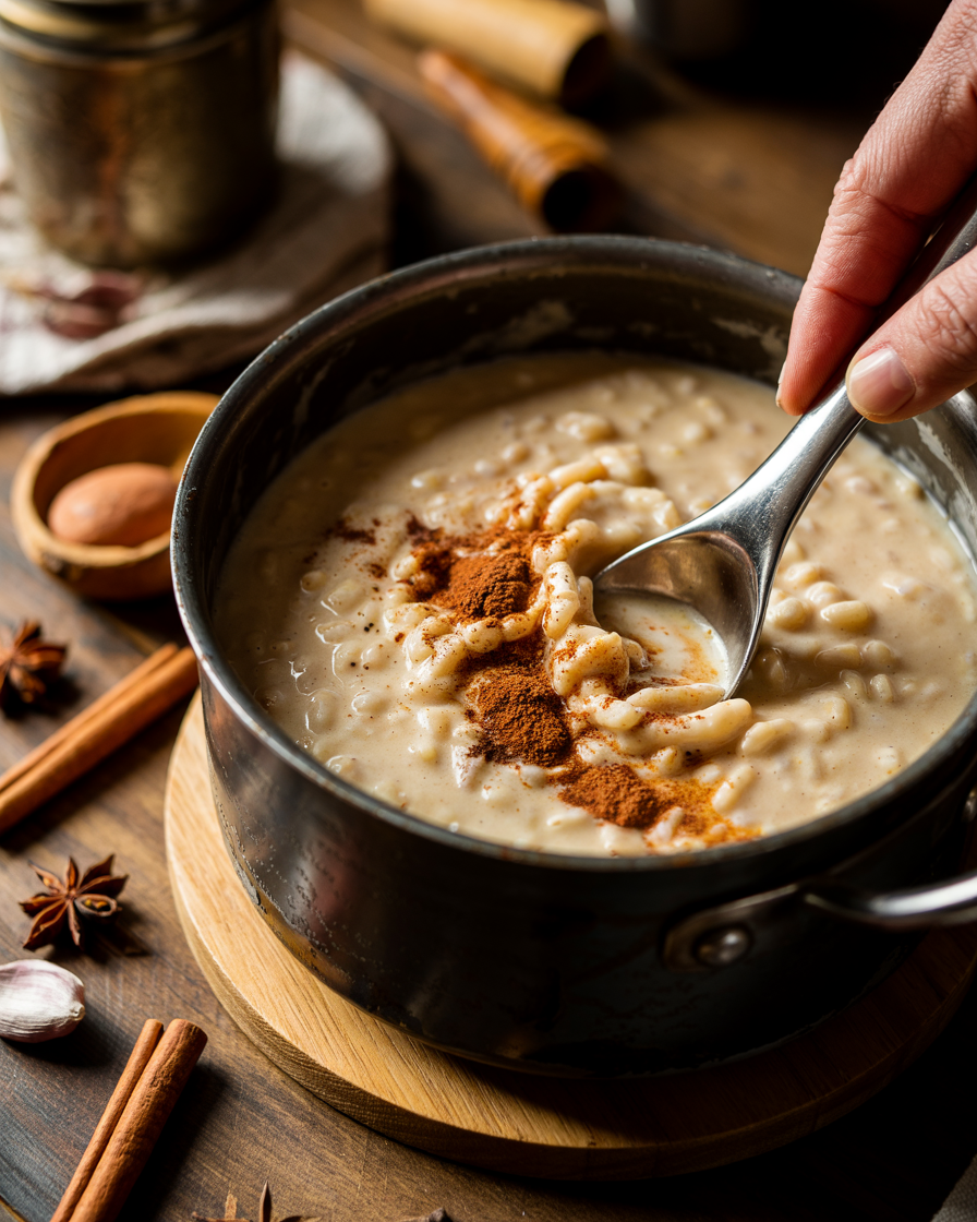 Stir in the cinnamon, ginger, cardamom, cloves, nutmeg, and salt. Reduce the heat slightly and let the spices bloom in the warm milk for 3–4 minutes, stirring occasionally.