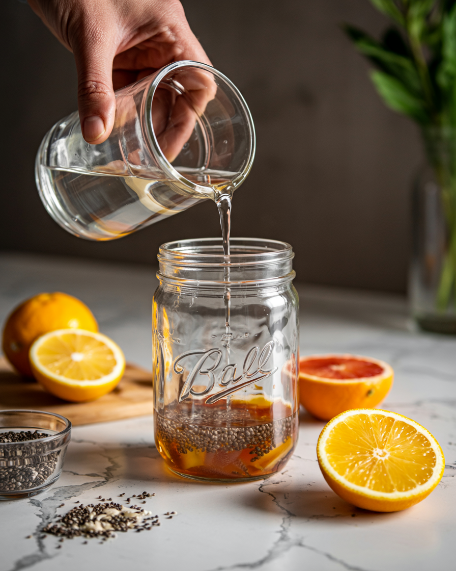 Add chia seeds to a glass or jar. Pour citrus juice over them, then stir well. Let them sit for 10–15 minutes to absorb the liquid and form a gel-like consistency.