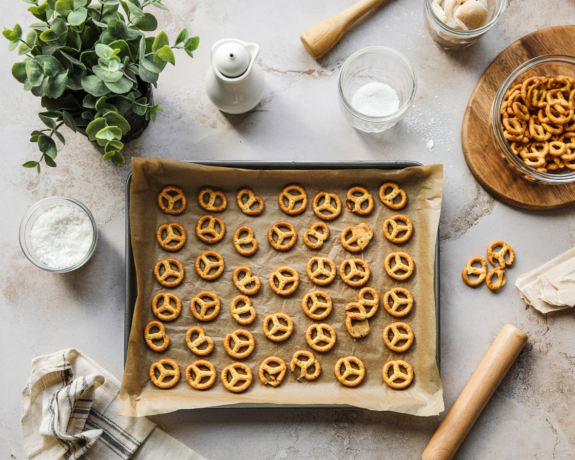 Arrange mini pretzels in a single layer on a parchment-lined tray.