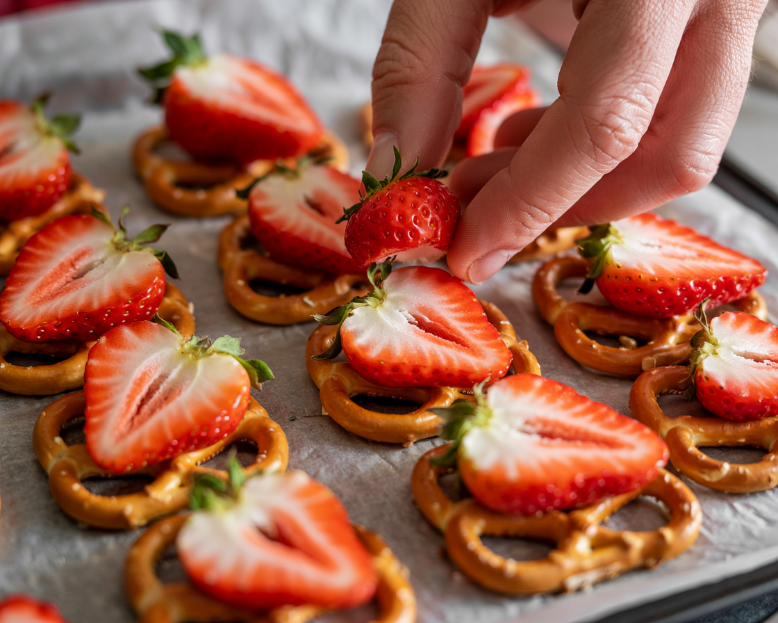 Place a strawberry slice on top of each pretzel.