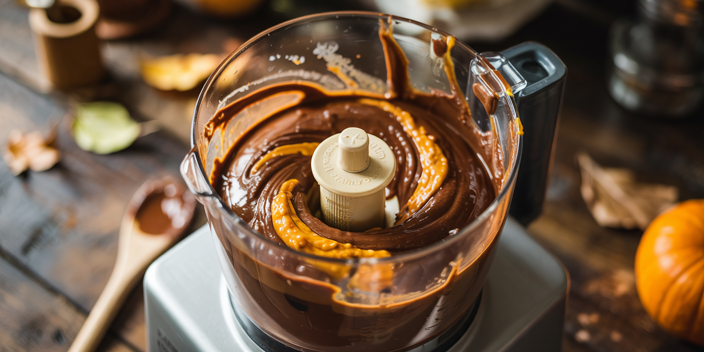Add pumpkin puree, almond butter, maple syrup, vanilla, cinnamon, nutmeg, and salt. Blend until everything comes together into a sticky dough.