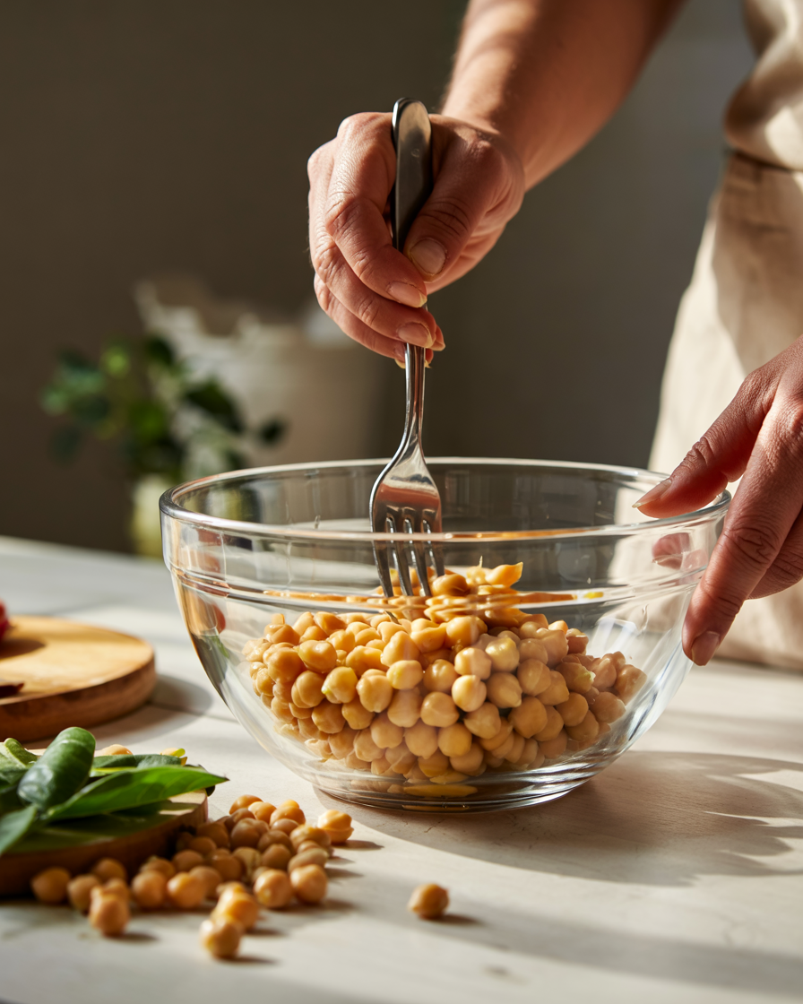 Do not over-mash chickpeas; texture improves with partial chunks.