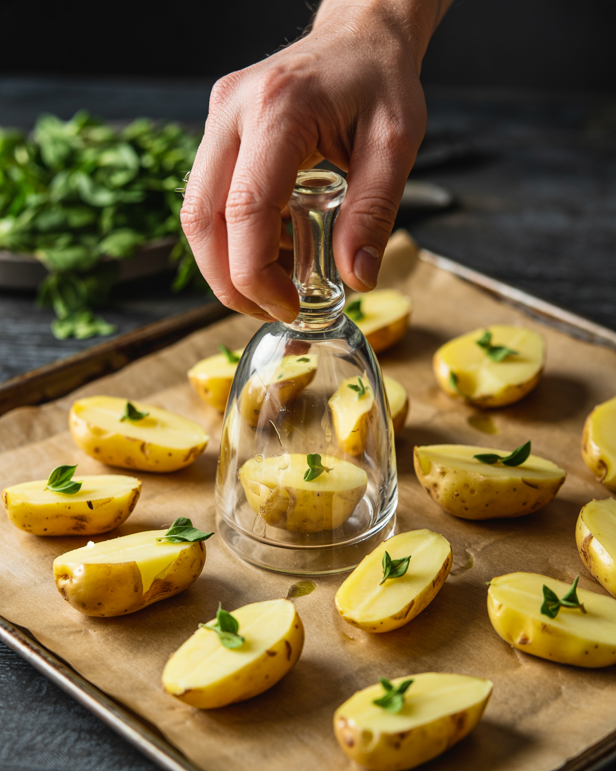 Transfer potatoes to a lined baking sheet and gently smash each one with the bottom of a glass.