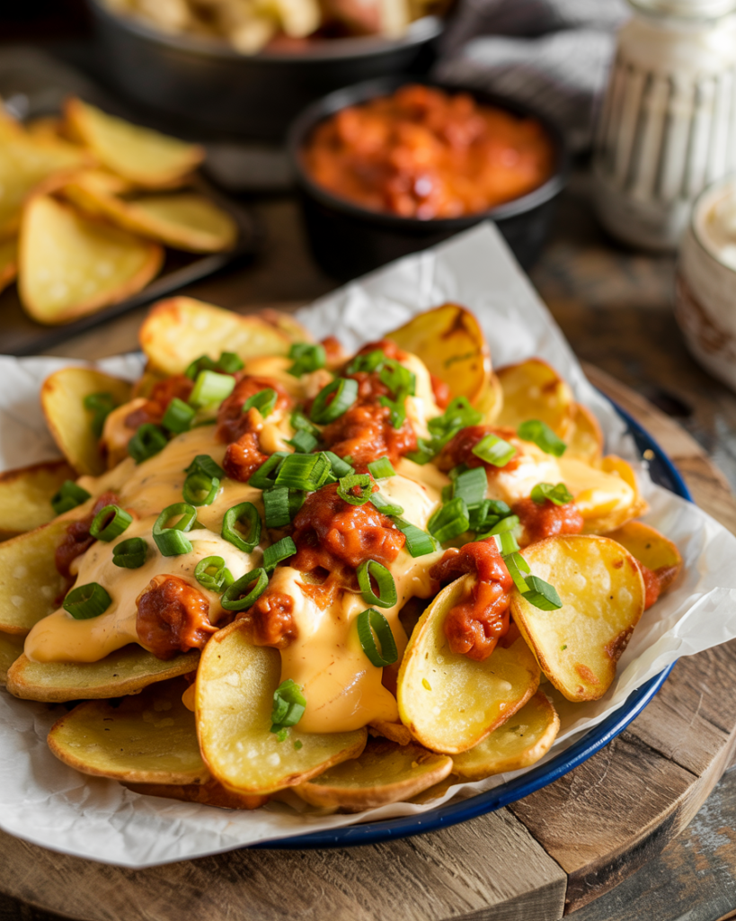 The savory seasonings that coat the crispy potatoes play a crucial role in enhancing the overall taste experience. A blend of garlic powder, smoked paprika, and a pinch of cayenne pepper provides a warm and inviting aroma, awakening the palate while infusing the dish with a subtle heat. This careful mix of spices gives the nachos a savory depth that beautifully complements the natural earthiness of the potatoes.