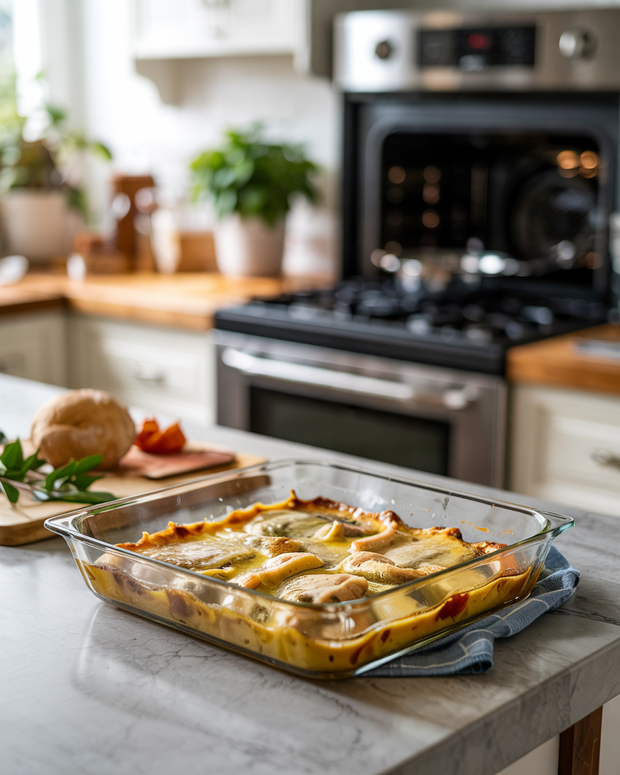 Pour the mixture into the prepared baking dish and smooth the top evenly. Bake for 30–35 minutes until the center is set and the top is lightly golden.