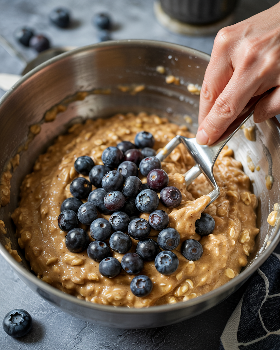 Pour the blended mixture into the bowl of dry ingredients. Stir until fully combined. Fold in the blueberries gently to prevent crushing.