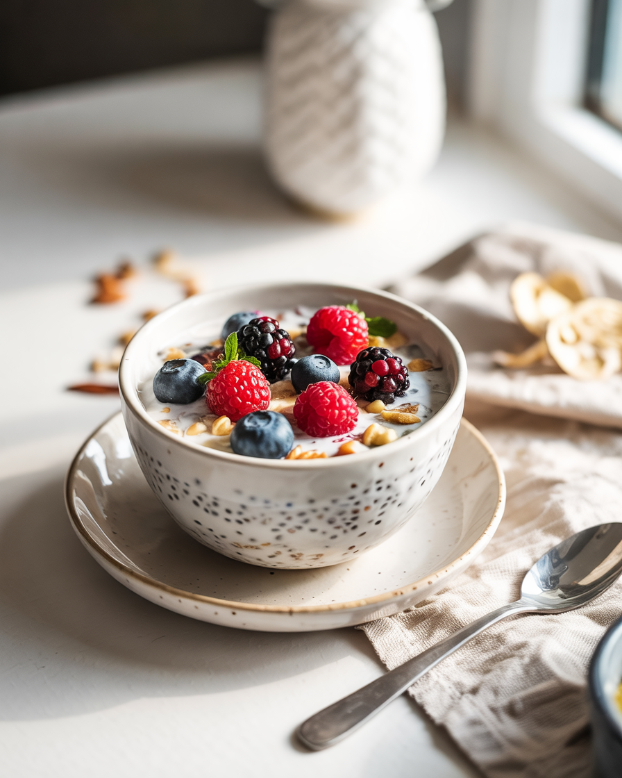 Allow the bowl to rest for 10–15 minutes so chia seeds hydrate and thicken the mixture