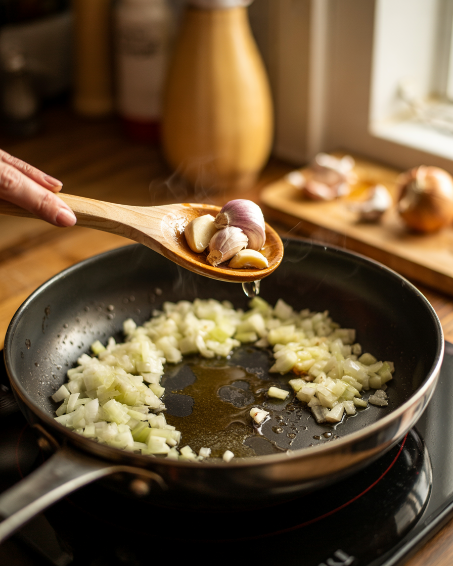Heat olive oil in a pan over medium heat. Add the diced onion and cook for 3–4 minutes until soft. Add garlic and cook for another 30 seconds until fragrant.