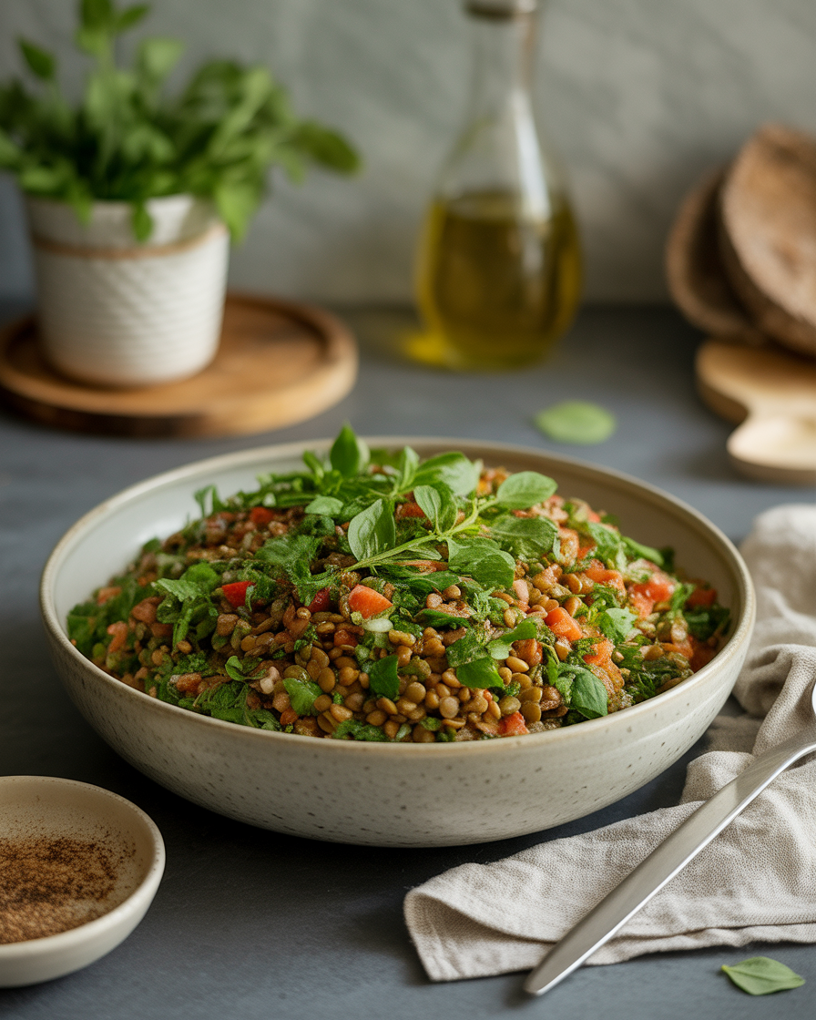 This high protein lentil tabbouleh bowl is fresh, herb-forward, and protein-rich. It swaps grains for lentils to create a balanced vegan meal that works well for meal prep.