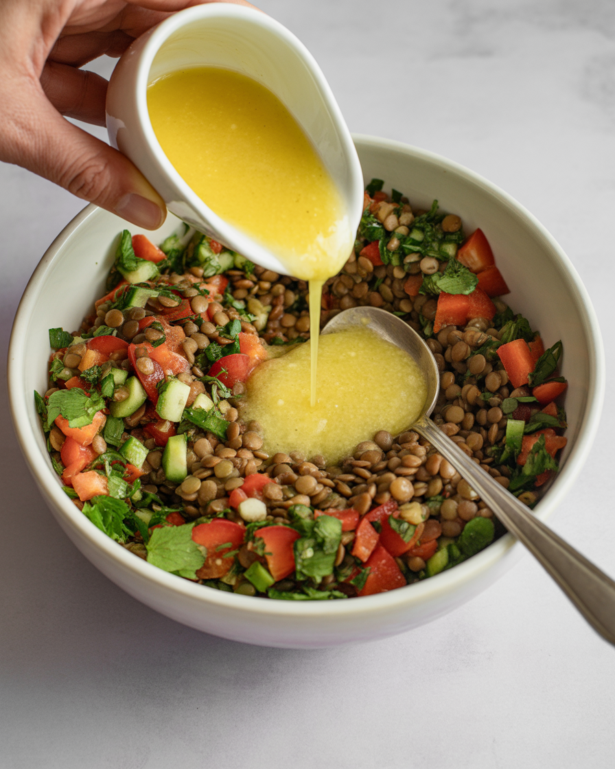 In a large mixing bowl, combine cooled lentils with chopped vegetables and herbs.