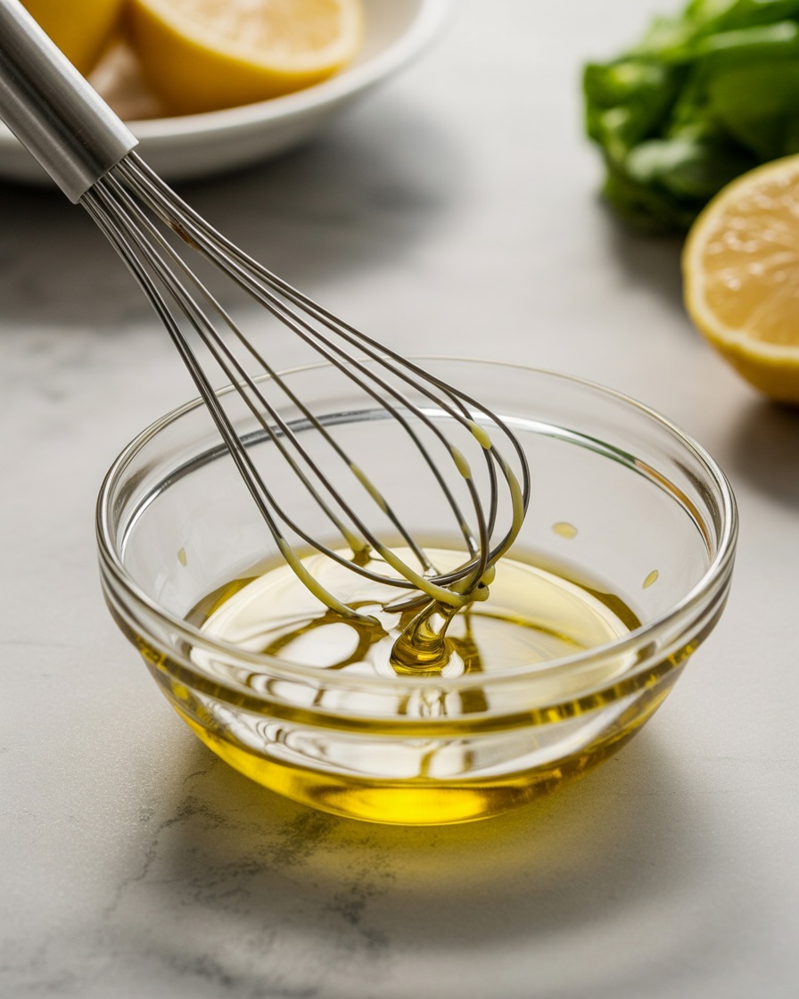In a small bowl, whisk together lemon juice, olive oil, salt, and pepper until combined.