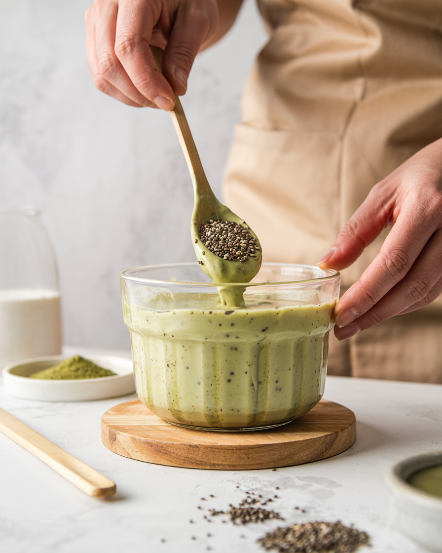 This breakfast cream is intentionally light yet filling. The chia seeds gently thicken the mixture without creating heaviness, while the matcha provides calm, sustained energy instead of a sharp caffeine spike. The vanilla protein softens the earthy notes of matcha, keeping the flavor balanced and approachable.