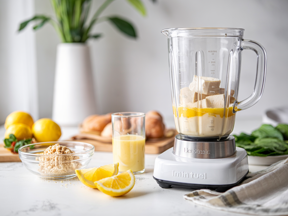Add tofu, lemon juice, nutritional yeast, salt, and pepper to a blender and blend until smooth.