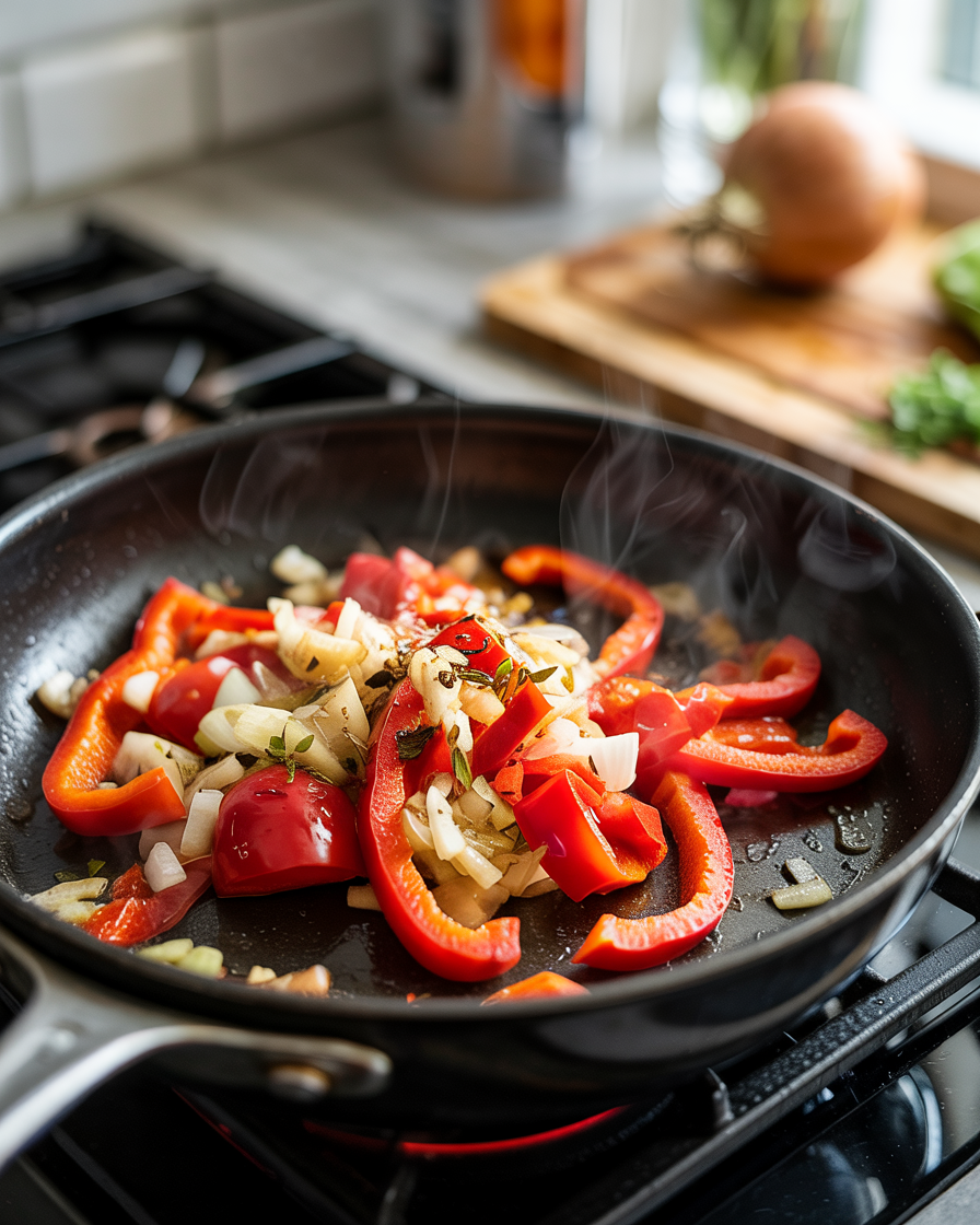 Heat olive oil in a nonstick skillet over medium heat. Add diced onion and bell pepper. Cook for 3–4 minutes until softened.