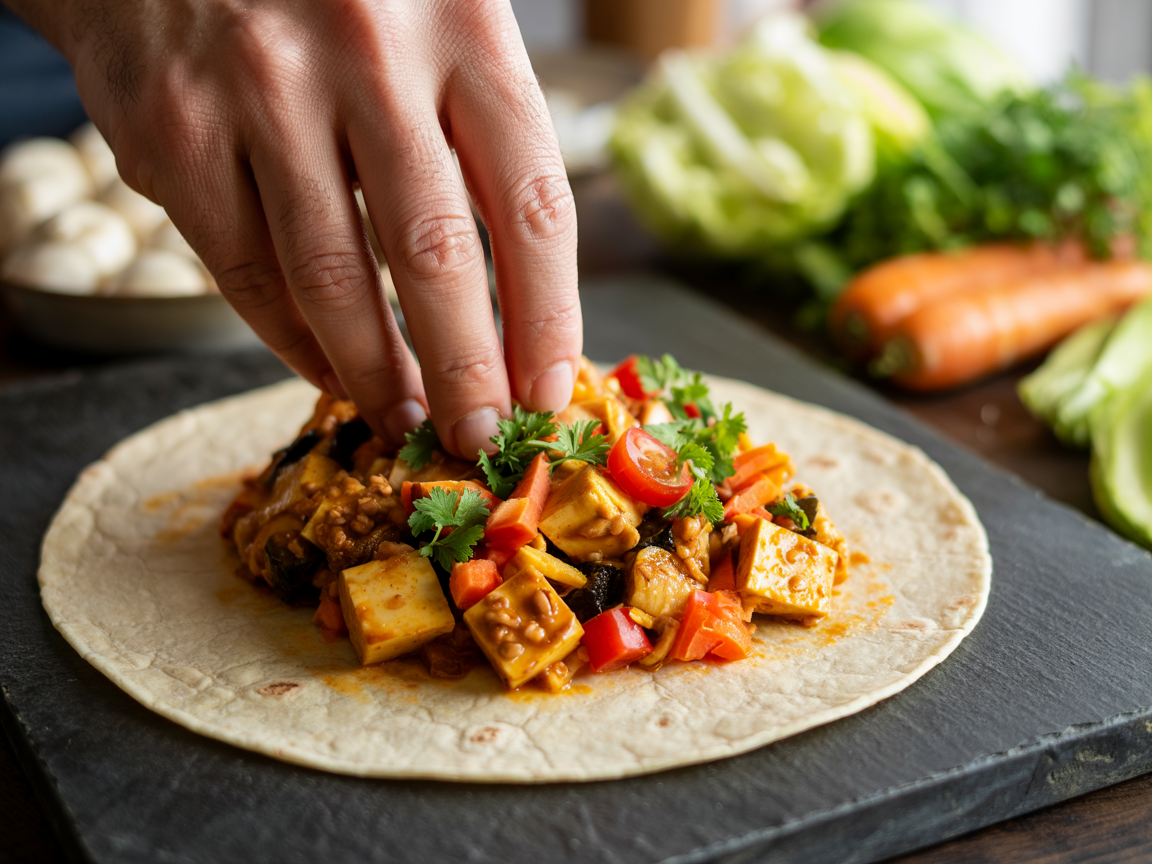 1. Spoon the tofu and vegetable mixture into the center of the warm tortilla and roll tightly.