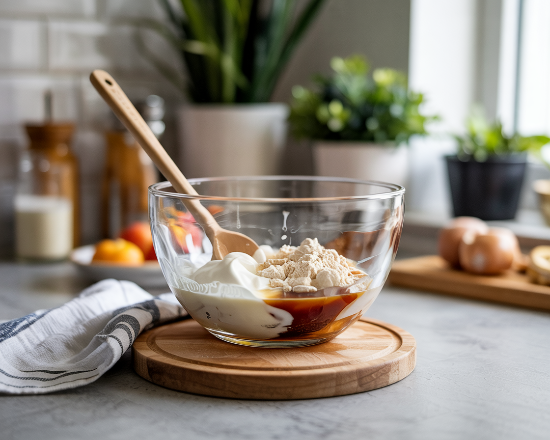 Add yogurt, cream cheese, protein powder, maple syrup, and vanilla extract to a mixing bowl.