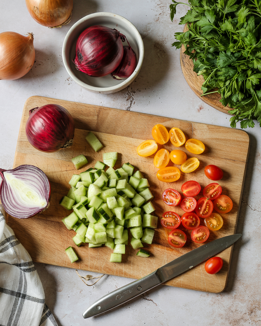 Dice cucumber, halve cherry tomatoes, finely dice red onion, and chop parsley.