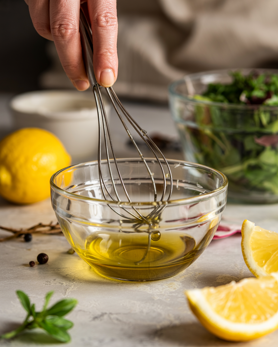 In a small bowl, whisk together olive oil, lemon juice, salt, and pepper until fully combined.