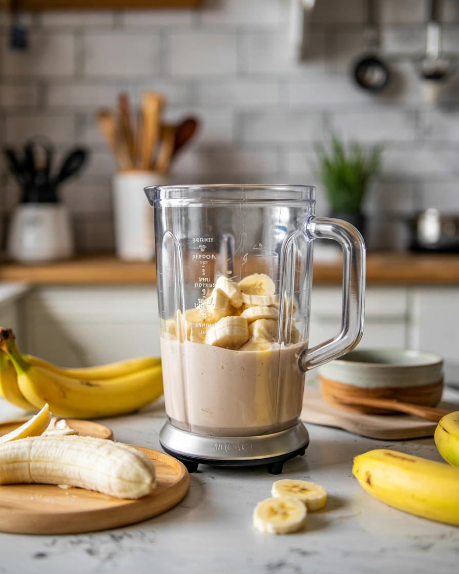 Add frozen banana, Greek yogurt, and vanilla to blender. Blend until thick and creamy.