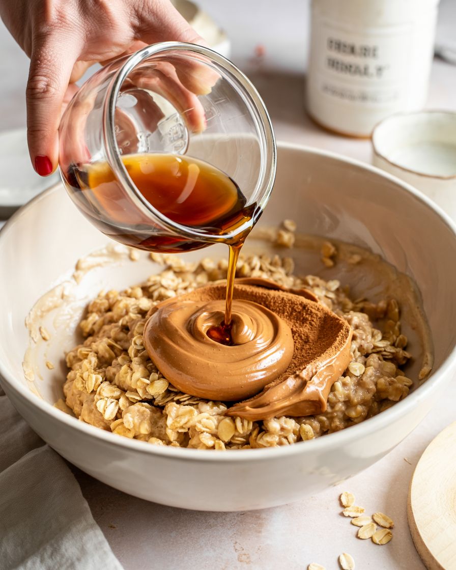 Add peanut butter, maple syrup, almond milk, and vanilla extract to the bowl.