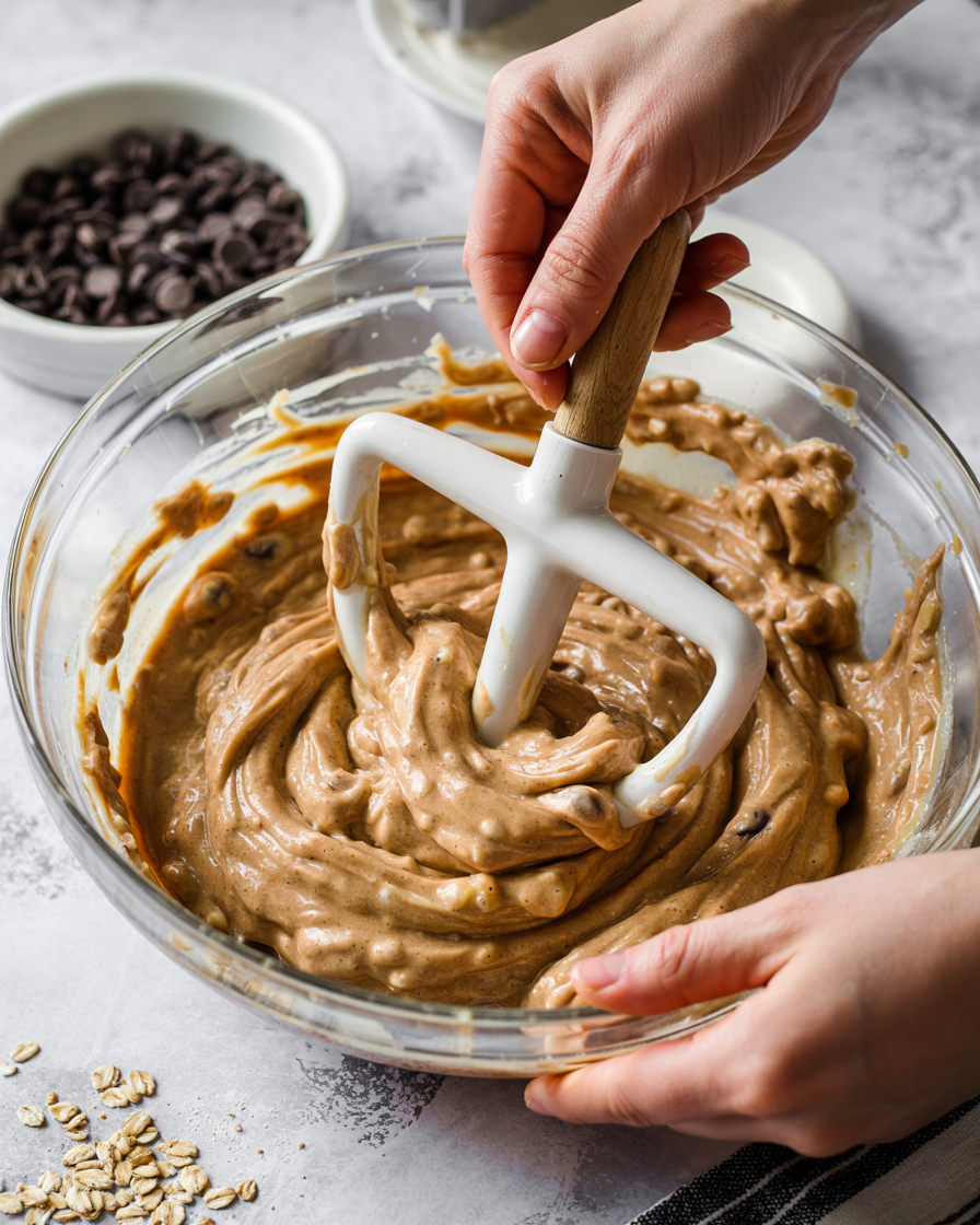 Stir the ingredients until a thick batter forms. Fold in chocolate chips if using.