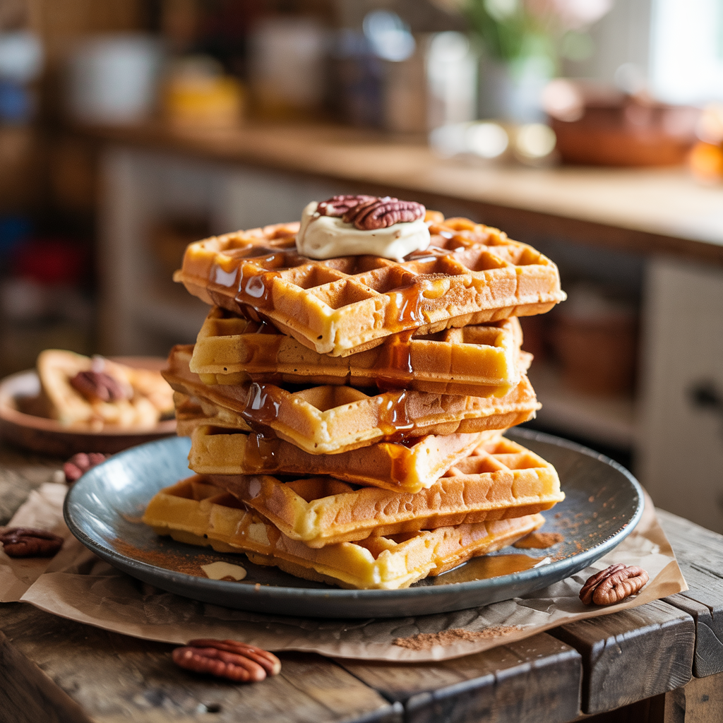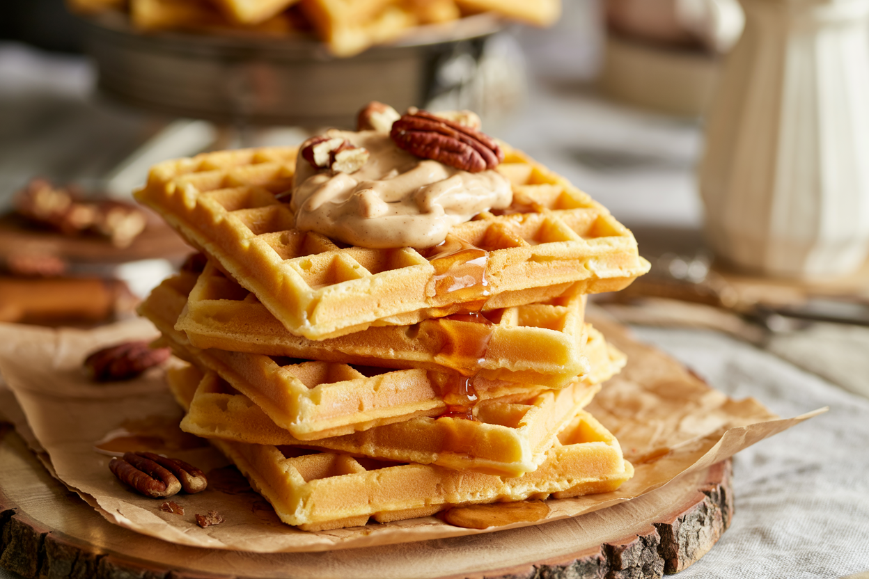 Pumpkin Chai Waffles with Maple Pecan Butter