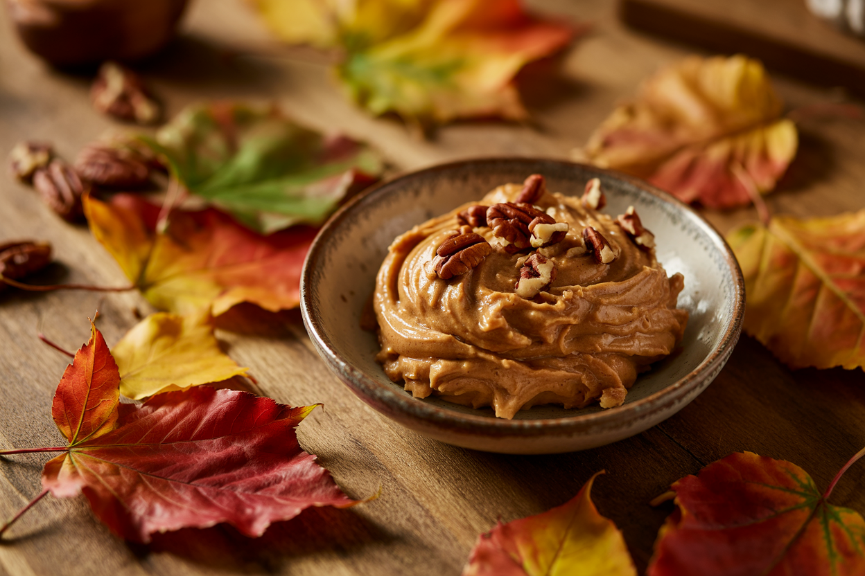 Mix vegan butter, maple syrup, pecans, and cinnamon until creamy. Chill for 5–10 minutes to set slightly.