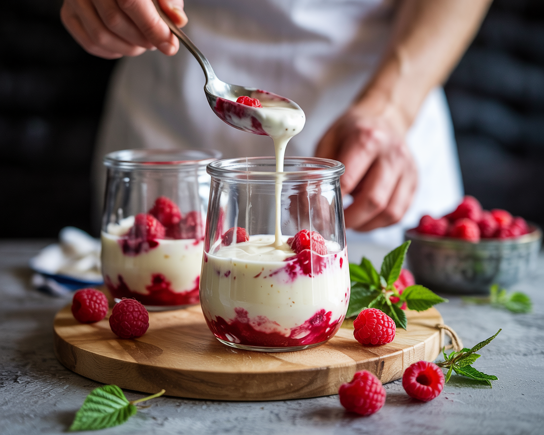 Raspberry adds a naturally bright, slightly tart flavor that balances the richness of the creamy base. It keeps the dessert feeling fresh instead of overly sweet, making each spoonful light and enjoyable. Combined with protein, it creates a dessert that feels indulgent but still nourishing.