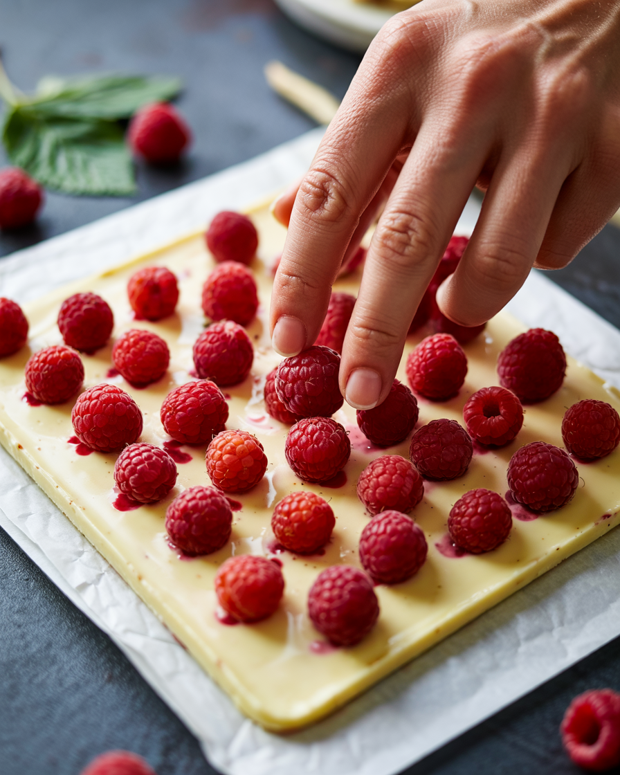 Gently press fresh raspberries into the melted white chocolate while it is still warm.