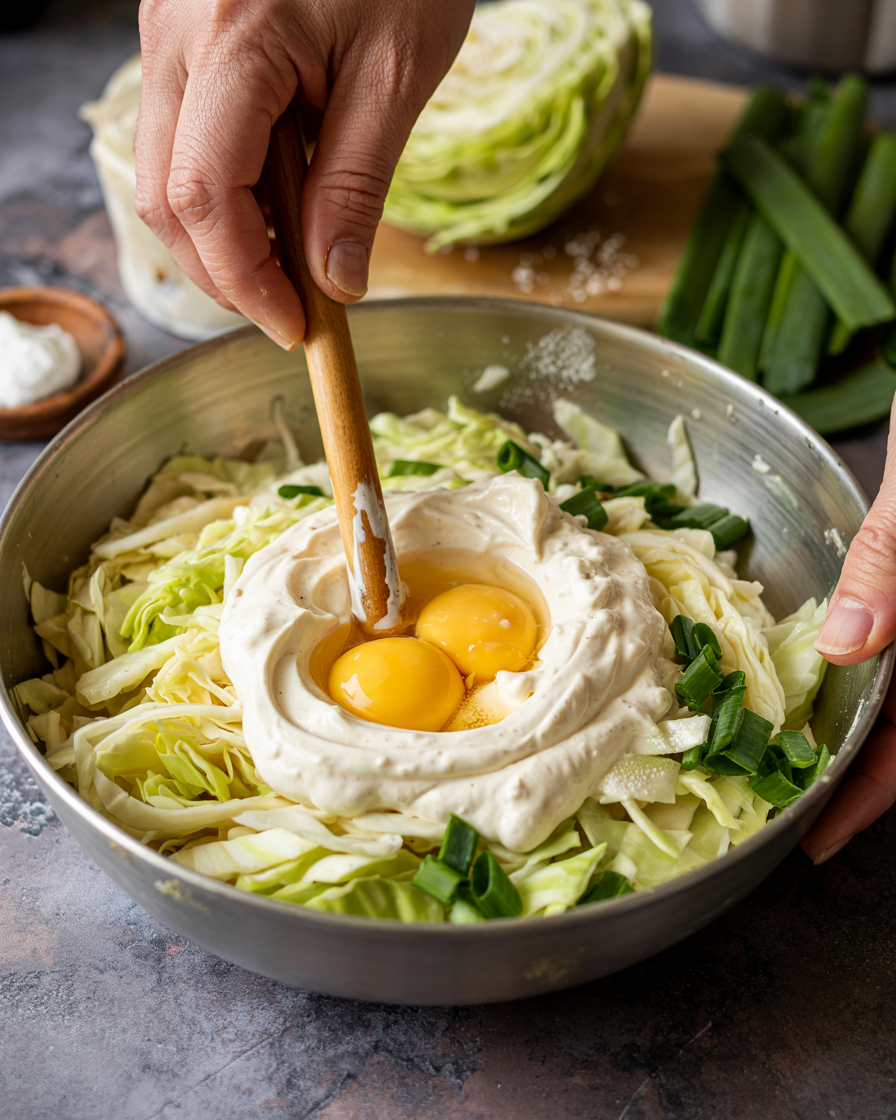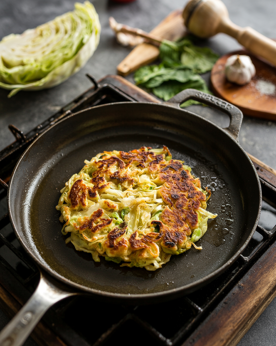 Scoop the cabbage mixture into the skillet and press into a round pancake shape. Cook for 5–7 minutes until golden underneath.