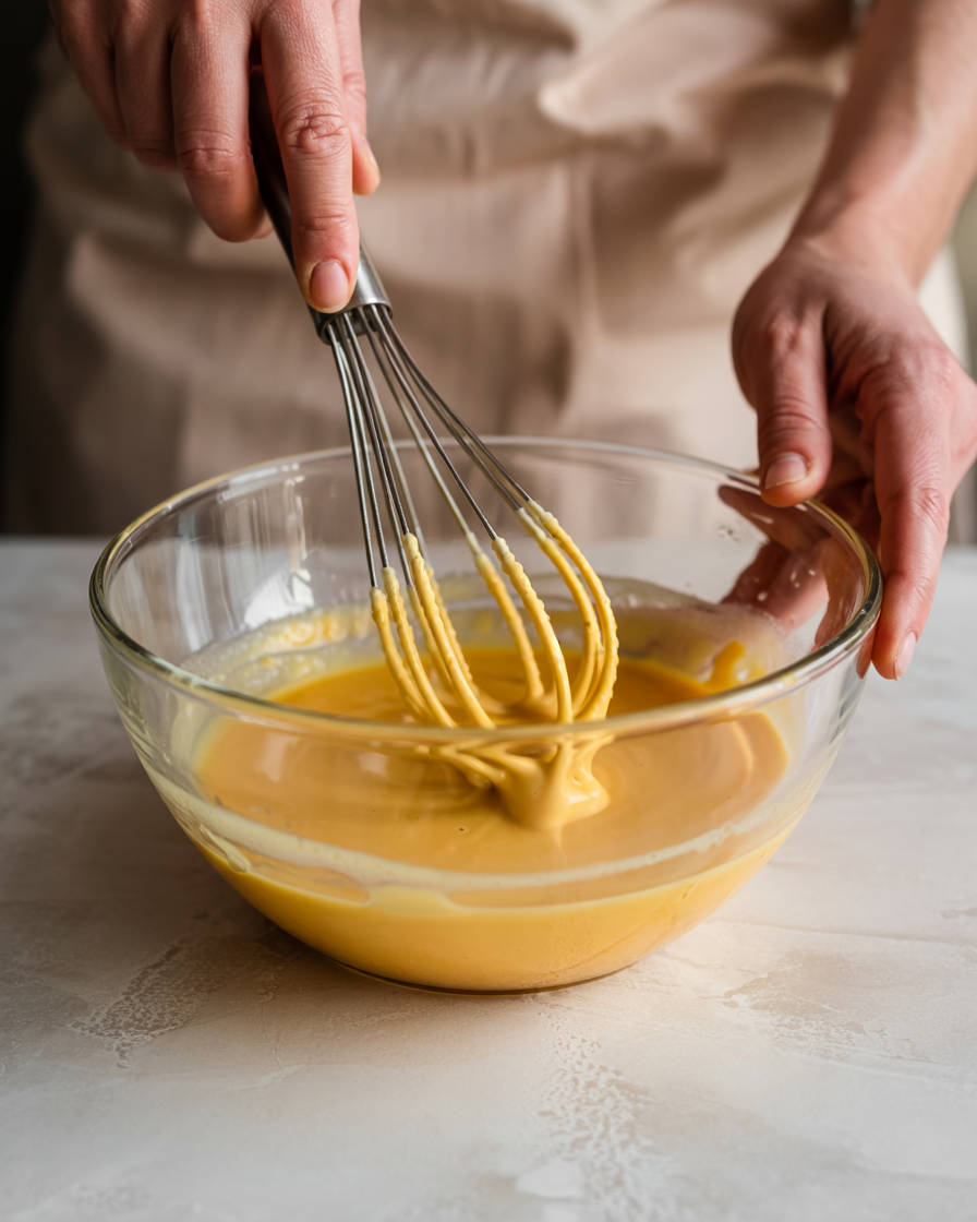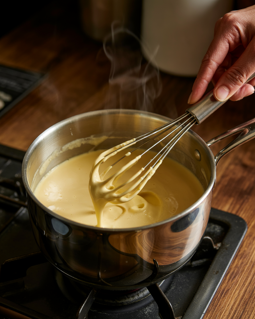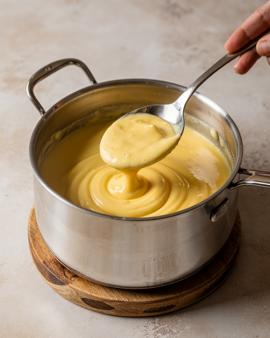 Pour the mixture into a saucepan and cook over low heat, whisking constantly, until it thickens into a silky custard consistency.