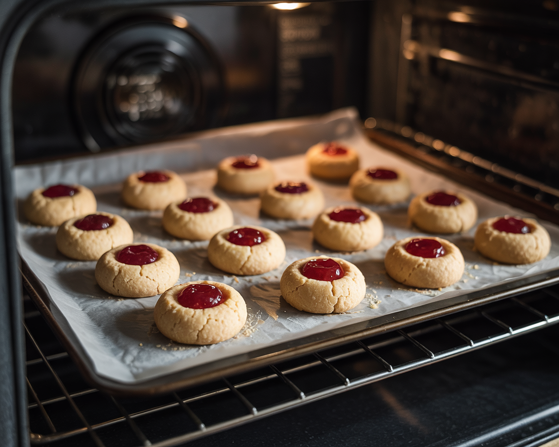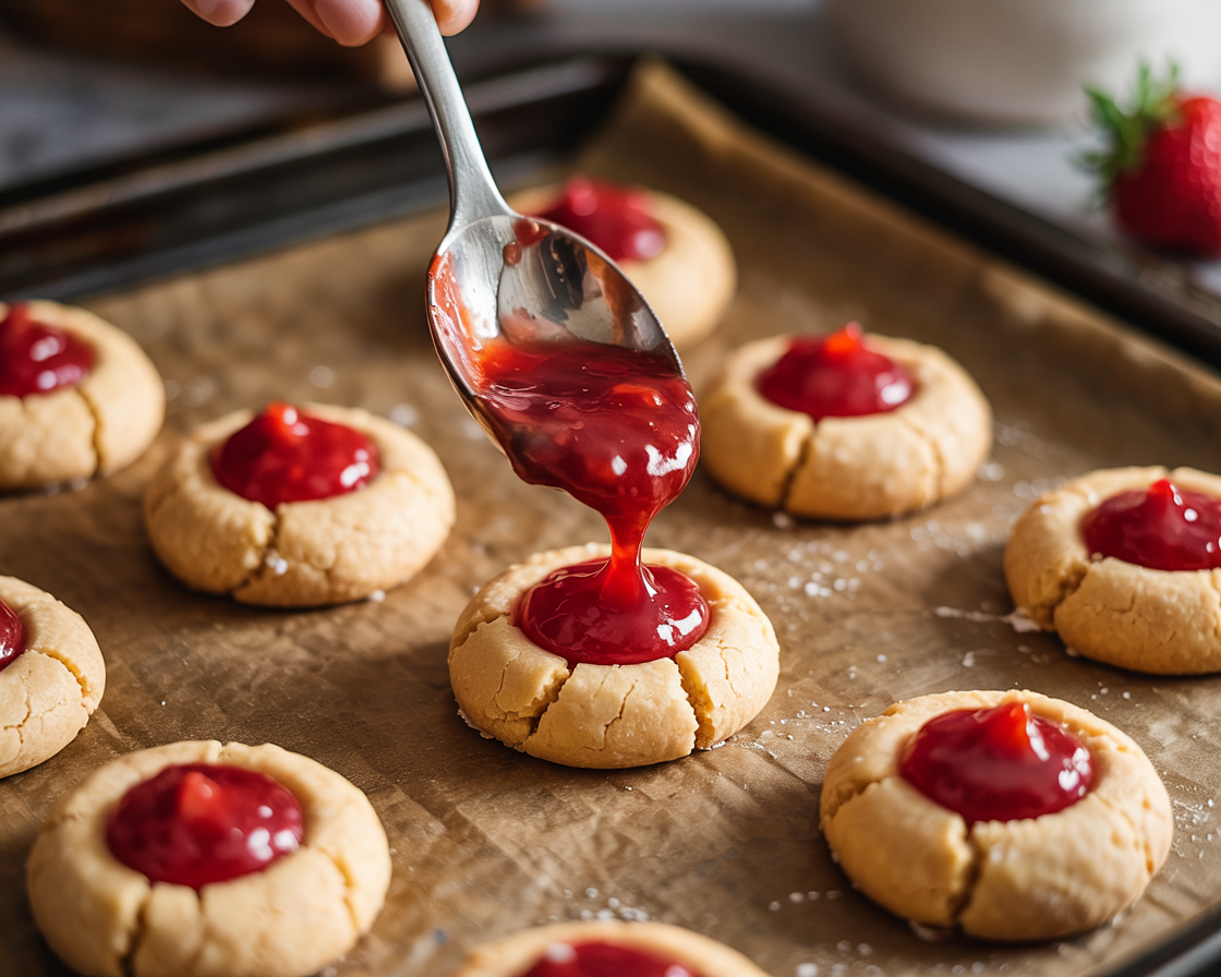Spoon strawberry jam into each thumbprint center, filling but not overflowing.