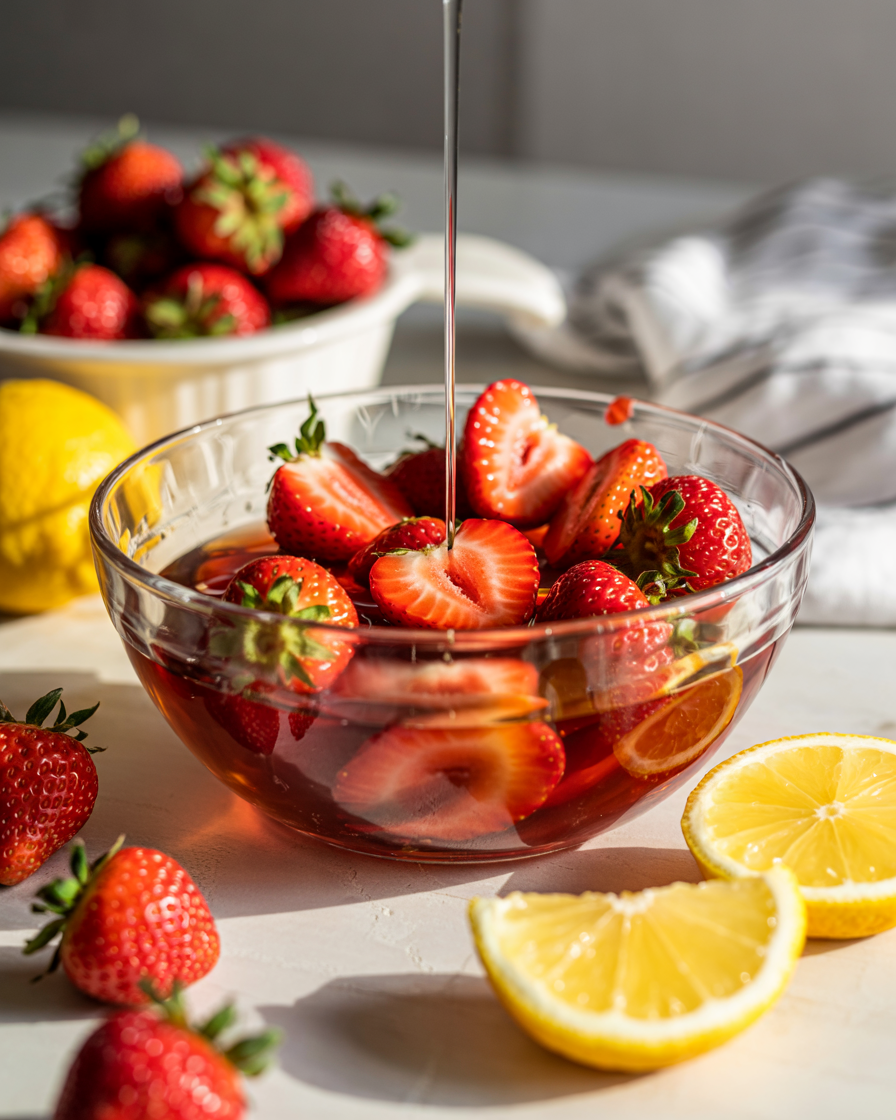 Add sliced strawberries to a bowl with maple syrup and lemon juice. Toss gently and set aside for 10 minutes to release juices.