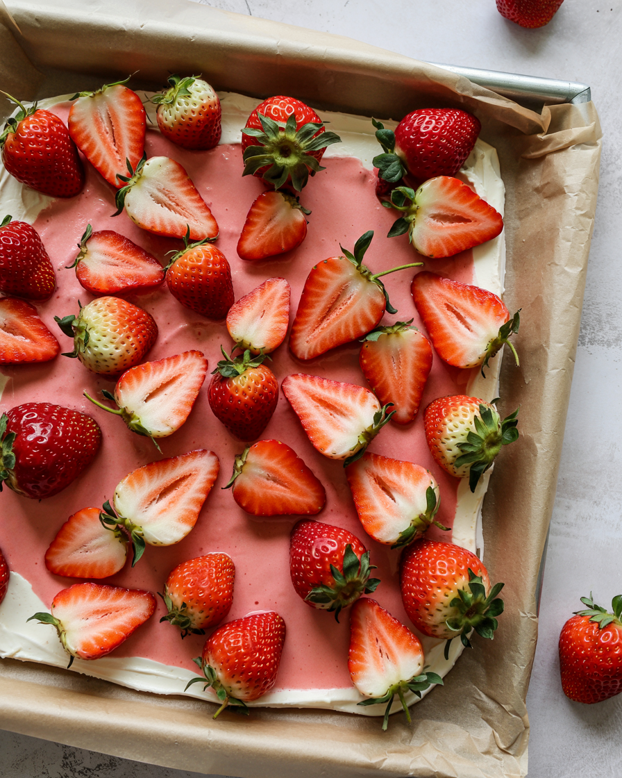 Spoon half of the macerated strawberries evenly over the cream layer.